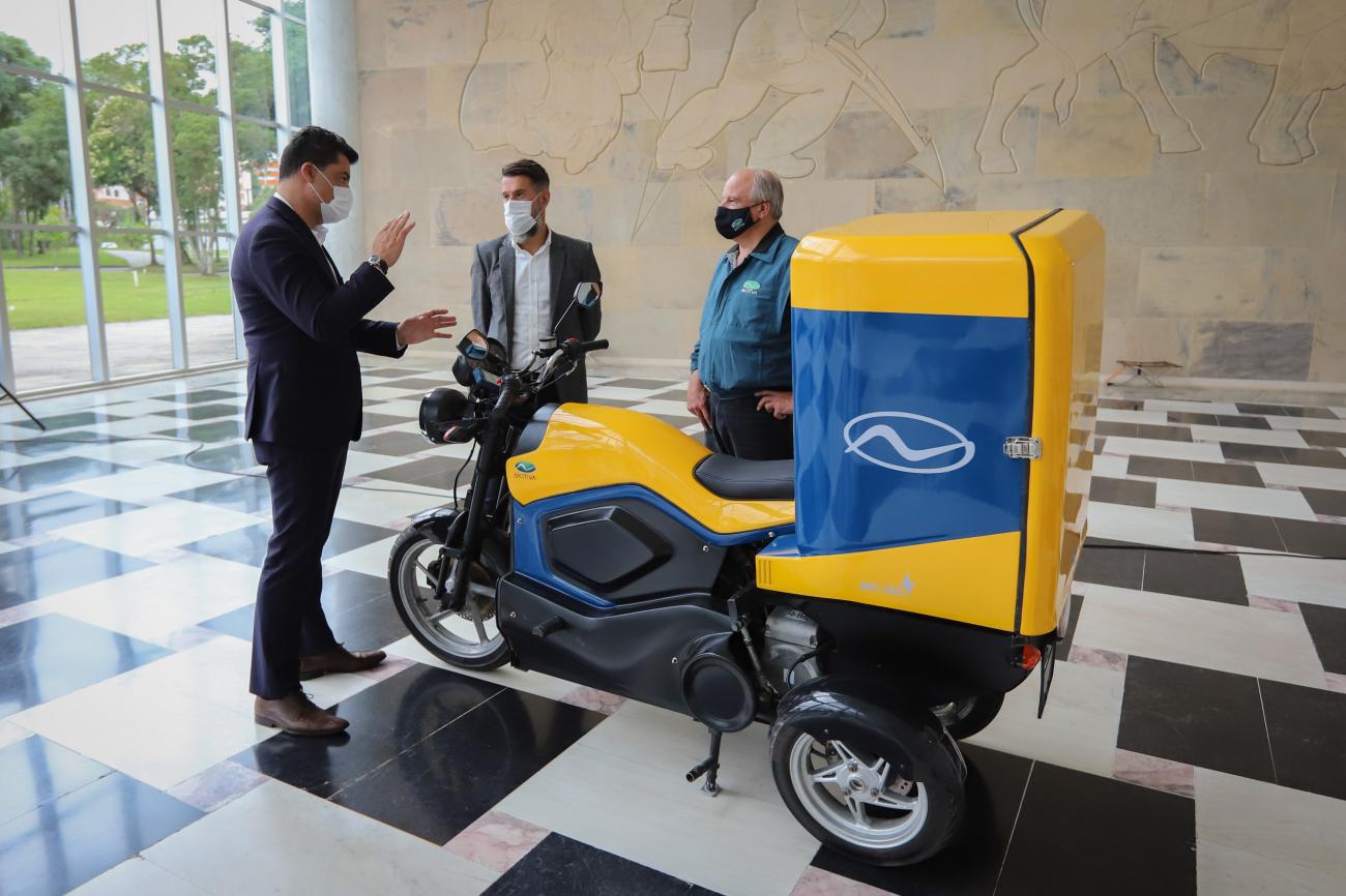 Um triciclo híbrido flex fabricado no Paraná com componentes de origem 100% nacional estará nas ruas em breve. O protótipo foi apresentado ao Governo do Estado nesta sexta-feira (17), no Palácio Iguaçu, pelos sócios da empresa Motiva Motocicletas. O contato foi com a Superintendência Geral de Inovação (SGI), órgão vinculado à Casa Civil, que faz a ponte entre soluções e demandas do mercado e o Poder Público, além de fomentar o ambiente de negócios, fazendo com que o Estado possa se abrir a iniciativas inovadoras.