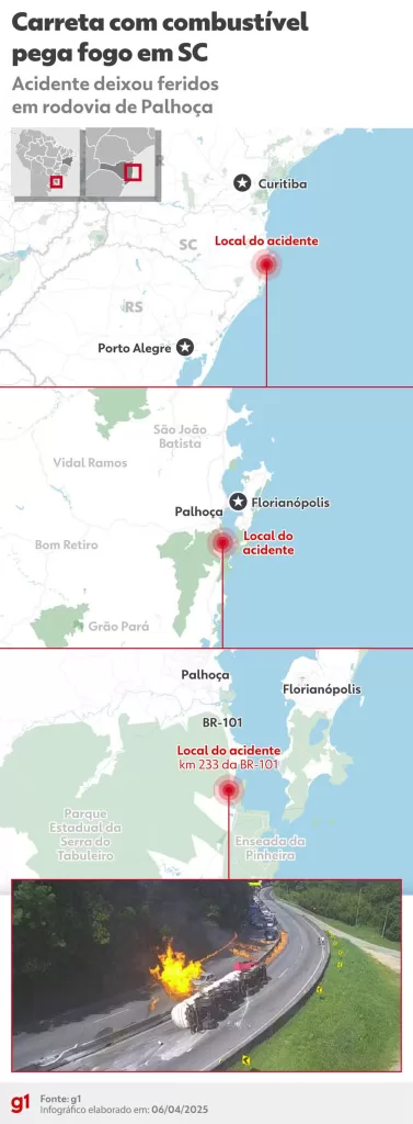 O tombamento ocorreu no sentido Norte da pista. O motorista da carreta e a esposa dele tiveram queimaduras nos braços e pernas e foram levados para Unidade de Pronto Atendimento (UPA) da Pinheira, em Palhoça. Ele teve 30% do corpo queimado e ela, 20%, conforme os bombeiros.