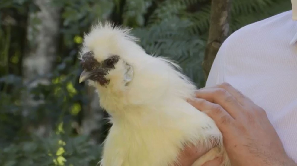 “Diferentemente das outras raças de galinhas, que têm quatro dedos, a Sedosa tem cinco. Os pés todos emplumados e a pele dela é azul”, disse.