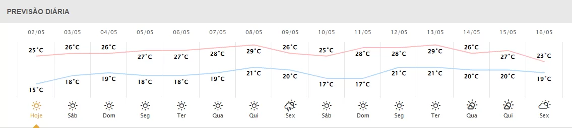 Foz do Iguaçu: Sexta-feira com sol entre nuvens altas, máxima de 26°C. Sábado com sol entre nuvens altas, máxima de 27°C. Domingo predominantemente nublado, máxima de 28°C.