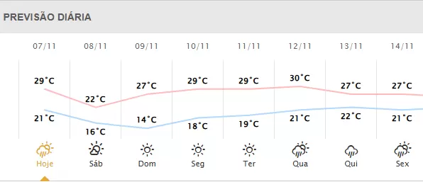Em Marechal Cândido Rondon nesta sexta-feira (7) a mínima deve ser de 21°C e máxima de 29°C. A previsão é de chuva começando à tarde com acumulo de 14,2 milímetros.