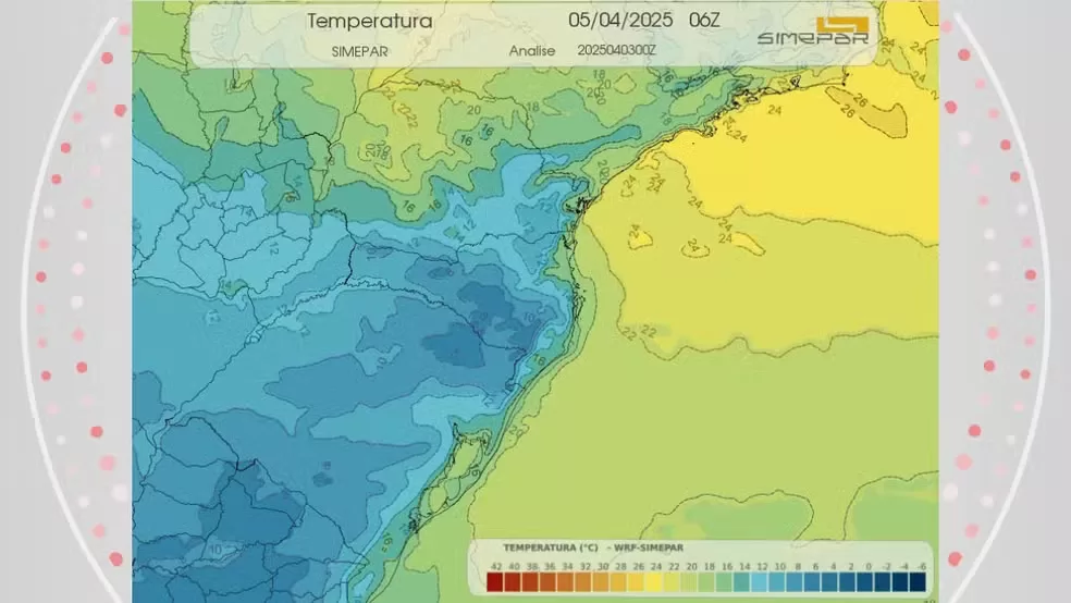 “O que vamos ter é o predomínio de um vento Sudeste/Sul associado a uma massa de ar frio que vai se aproximar do Paraná. O núcleo dessa massa de ar frio não vai atingir diretamente o Estado, mas, mesmo assim, vai influenciar o tempo no Centro-Sul e Leste paranaenses. […] Será uma mudança mais significativa nas condições do tempo com o retorno do frio um pouco mais rigoroso”, explica.