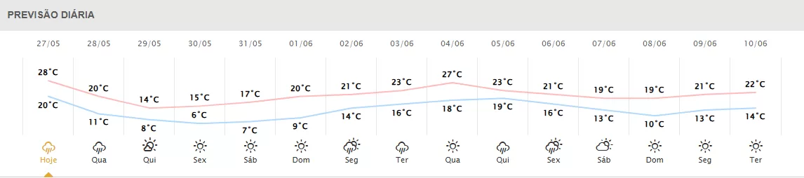 Foz do Iguaçu: Mínima de 20°C, máxima de 28°C, com 95% de probabilidade de chuva e acumulado de 28,5 milímetros.