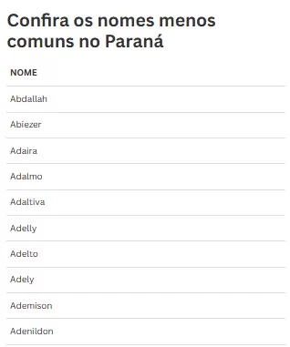 O Instituto Brasileiro de Geografia e Estatística (IBGE) identificou 839 nomes no Paraná que possuem no máximo 15 repetições. Entre eles, estão Teolide, Pracidio, Jaceline e Douguas. Veja a lista completa abaixo.