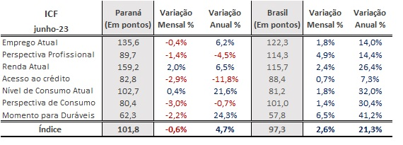 No entanto, em relação a junho de 2022 a ICF paranaense teve crescimento de 4,7% e está acima da média nacional, que ficou em 97,3 pontos. Mesmo com a elevação mensal de 2,6%, a ICF brasileira ainda demonstra a insatisfação dos consumidores.