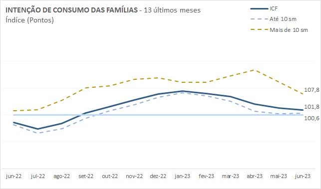 Entre as famílias de menor renda a ICF marcou 100,6 pontos, com aumento de 0,2% em junho, puxado pela avaliação positiva destes consumidores sobre sua Renda Atual (2,9%) e Nível de Consumo Atual (2,5%).