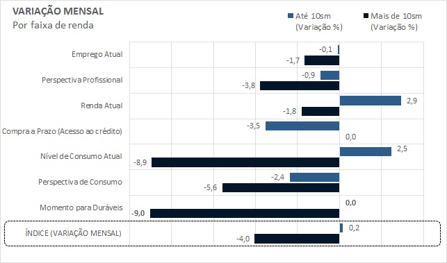 A opinião das famílias de maior renda é que mais impactou no resultado de junho no Paraná. Entre as famílias com renda acima de dez salários mínimos o índice ficou em 107,8 pontos, com baixa mensal de 4%. Todos os aspectos avaliados tiveram redução nessa faixa de renda, sobretudo Momento para Duráveis (-9%), Nível de Consumo Atual (-8,9%) e Perspectiva de Consumo (-5,6%).
