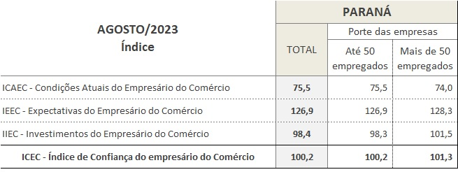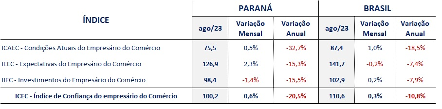 O quesito Condições Atuais do Empresário do Comércio (ICAEC) cresceu 0,5% na variação mensal e as Expectativas do Empresário do Comércio (IEEC) aumentaram 2,3% em agosto. Por outro lado, a projeção de Investimentos do Empresário do Comércio (IIEC) caiu 1,4%.