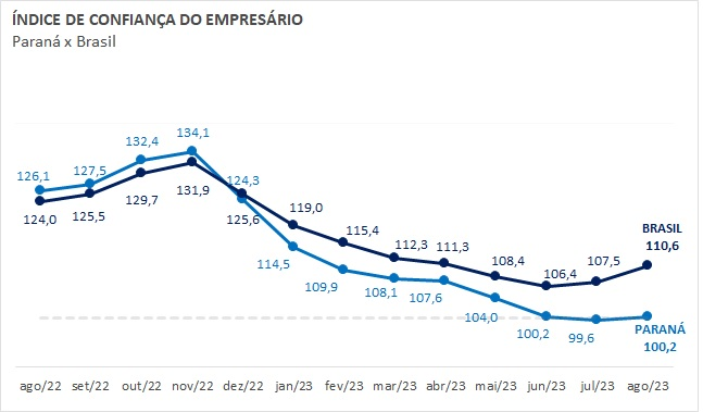 O Índice de Confiança do Empresário do Comércio (Icec) paranaense cresceu 0,6% em agosto, com 100,2 pontos. O resultado interrompe a sequência de quedas, iniciada em dezembro do ano passado, e volta à zona de satisfação, acima dos 100 pontos. A pesquisa, realizada mensalmente pela Confederação Nacional do Comércio de Bens, Serviços e Turismo (CNC) e pela Federação do Comércio de Bens, Serviços e Turismo do Paraná (Fecomércio PR), mostra uma melhora no otimismo dos empresários paranaenses, sobretudo em relação ao momento atual e em suas expectativas.