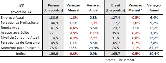 O índice de Intenção de Consumo das Famílias (ICF) teve ligeira queda em fevereiro no Paraná. O indicador, aferido pela Confederação Nacional do Comércio de Bens, Serviços e Turismo (CNC) e pela Federação do Comércio de Bens, Serviços e Turismo do Paraná (Fecomércio PR), teve redução de 0,3% na comparação com janeiro e ficou em 109 pontos. O ICF brasileiro também caiu 0,5% neste mês, mas ainda segue na zona de satisfação, com 105,7 pontos.