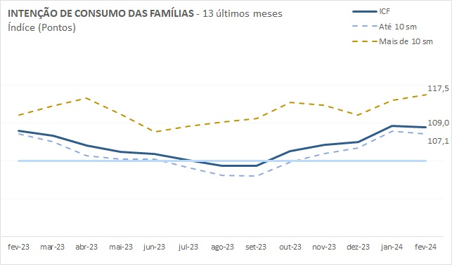 As famílias com renda até dez salários mínimos são as menos propensas a consumir, com 107,1 pontos na escala do indicador. Entre elas o ICF caiu 0,6% em fevereiro, principalmente por causa das dificuldades para obtenção de crédito, fator que reduziu 5,5% na comparação com janeiro, além da segurança no emprego, que apresentou queda de 2,4%.