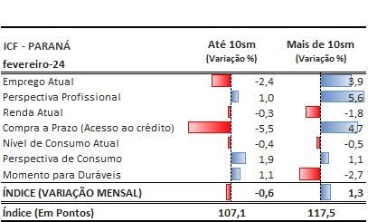 Os pontos de maior apreensão dos consumidores paranaenses são o Acesso ao crédito, que teve baixa de 3,5%, bem como a segurança no Emprego Atual (-1,3%), Renda Atual (-0,6%) e Nível de Consumo Atual (-0,4%).
