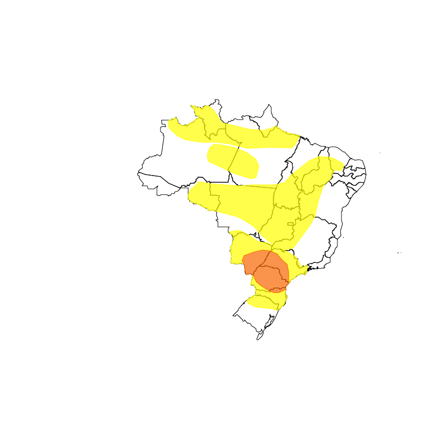 O alerta é para chuva com intensidade entre 30 mm por hora e 60 mm/h ou 50 até 100 mm/dia, com ventos na velocidade de 60 km/h a 100 km/h e risco de queda de granizo.