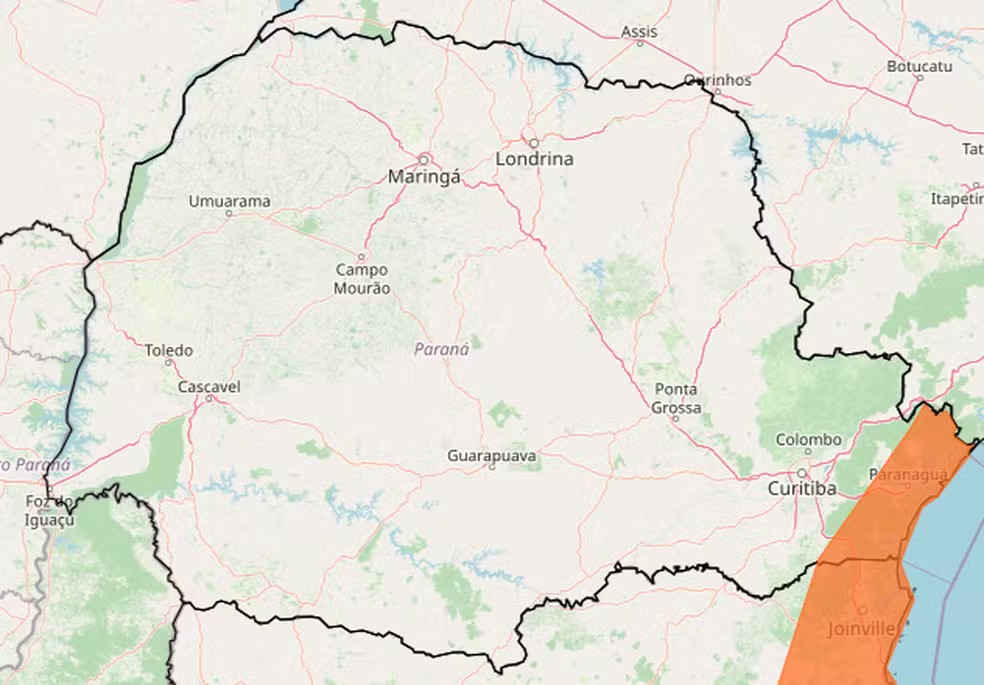 Para a Grande Curitiba e litoral, o alerta é válido até às 23h desta quinta. São previstos temporais de até 100 milímetros, com risco de alagamentos, deslizamentos de encostas e transbordamento de rios.