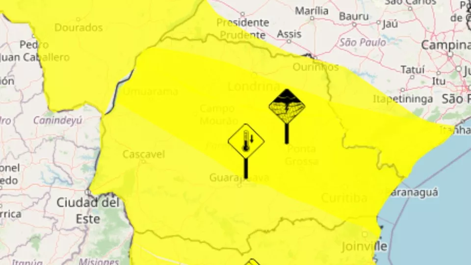 Dois alertas por queda repentina de temperatura foram emitidos e englobam praticamente o estado todo. A diferença é que o comunicado para a região do Norte Pioneiro se encerra às 10 horas desta segunda-feira, enquanto para as demais regiões o alerta segue até às 23h59.