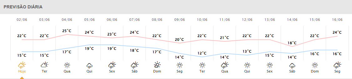 Foz do Iguaçu: mínima de 14°C e máxima de 20°C, com expectativa de 13,8 milímetros de precipitação.