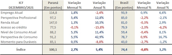 A avaliação interanual do ICF, em que se compara dezembro de 2021 (100,1 pontos) com dezembro de 2020 (95,0 pontos), revela melhora considerável, com elevação de 5,4%. Na comparação de dezembro com novembro (97,5 pontos), o índice subiu 2,7%.
