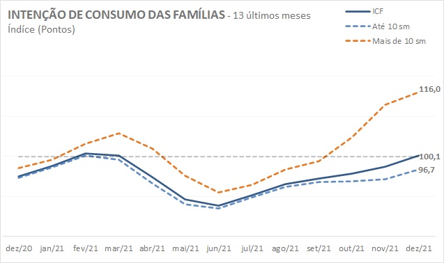Já entre as famílias de maior rendimento, o indicador de consumo melhorou em 2021 (101,5 pontos na média) em relação a 2020 (100,6 pontos), sendo que ambos se mantiveram acima da zona de satisfação, mesmo tendo ficado bastante abaixo do período pré-pandemia (114,1 pontos em 2019).
