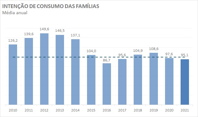 A Intenção de Consumo das Famílias (ICF) paranaenses, aferida pela Confederação Nacional do Comércio de Bens, Serviços e Turismo (CNC) e pela Federação do Comércio de Bens, Serviços e Turismo do Paraná (Fecomércio PR), encerrou o ano de 2021 com retração de 2,5% e média de 95,1 pontos. Foi a segunda menor média anual da série histórica e ficou abaixo, inclusive, de 2020, quando a média do indicador foi de 97,6 pontos, com redução de 10,1% em relação a 2019 (108,6 pontos).