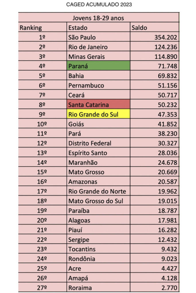Com o resultado positivo, o Paraná liderou a contratação nesta faixa etária na região Sul do Brasil, à frente de Santa Catarina (50.232 ) e do Rio Grande do Sul (47.353). No cenário nacional, o Estado ocupou a 4ª colocação, atrás de São Paulo (354.202), Rio de Janeiro (124.236) e Minas Gerais (114.890).