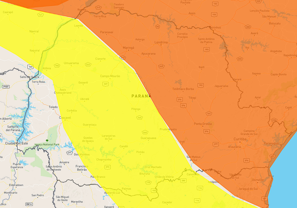 Para as regiões Norte, Nordeste, Noroeste, Sudeste, Centro, Sudoeste, Região Metropolitana de Curitiba, a previsão é de chuva entre 30 e 60 mm/h ou 50 e 100 mm/dia, ventos intensos (60-100 km/h), com risco de corte de energia elétrica, queda de galhos de árvores, alagamentos e de descargas elétricas.