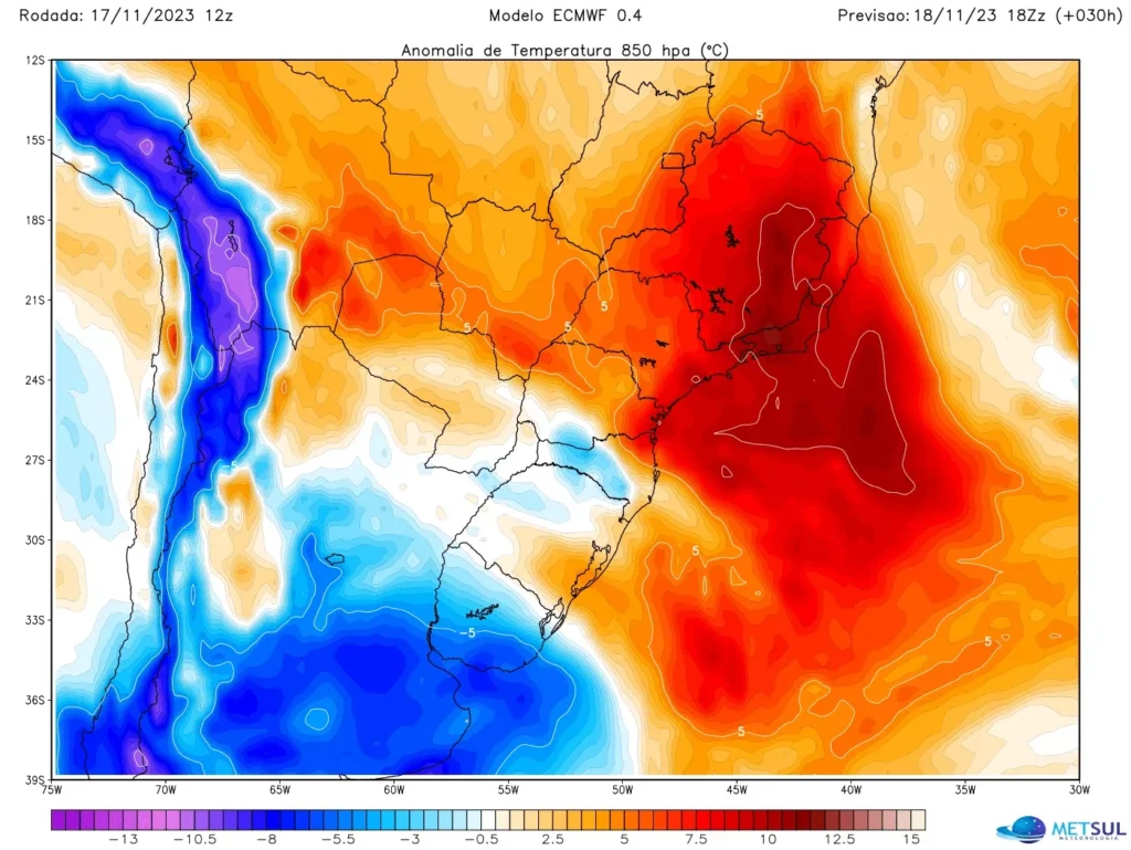 A MetSul Meteorologia alertou na sexta-feira (17) que a temperatura pode atingir valores excepcionalmente altos neste sábado (18) nos litorais do Paraná, de São Paulo, no estado do Rio de Janeiro e em partes de Minas Gerais pela combinação de uma massa de ar extremamente quente com vento forte em baixos níveis da atmosfera interagindo com o relevo.