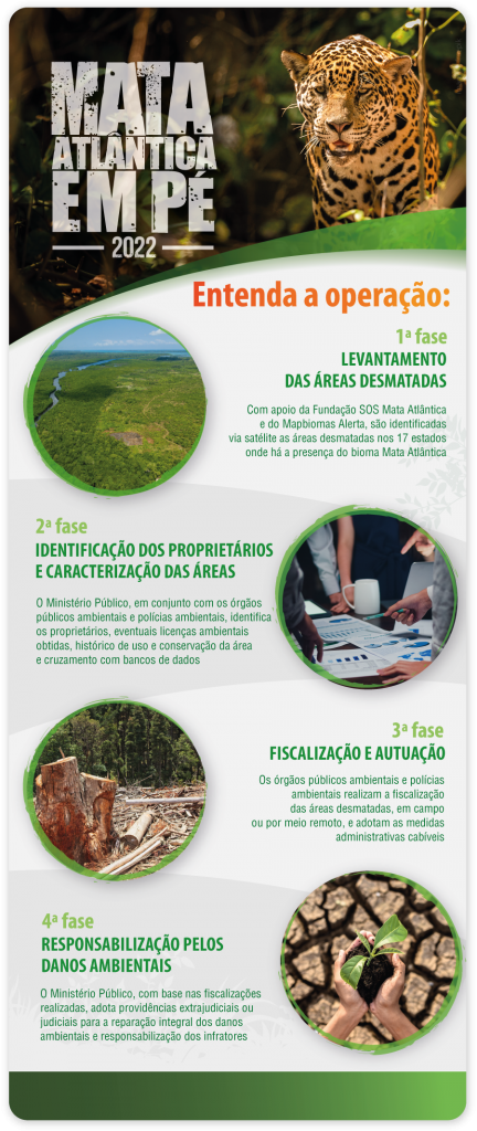 Durante os dias de operação, equipes dos órgãos ambientais visitarão as áreas onde há registros de alertas, acompanhadas de peritos do Instituto de Criminalística (ou órgão similar em cada estado), que elaborarão os respectivos laudos técnicos. “Essa atuação conjunta entre as instituições envolvidas é essencial para garantir a agilidade dos procedimentos e respostas rápidas à sociedade”, destaca o promotor, que coordena o Núcleo de Curitiba do Grupo de Atuação Especializada em Meio Ambiente, Habitação e Urbanismo (Gaema). Em 2021, a Operação Mata Atlântica em Pé identificou 8.189 hectares de vegetação suprimida ilegalmente em todo o país, alcançando o montante de R$ 55.531.184,19 em multas aplicadas – valor 70% superior às autuações de 2020. Ao todo, foram fiscalizados 649 polígonos nas 17 unidades da Federação em que a ação foi deflagrada.