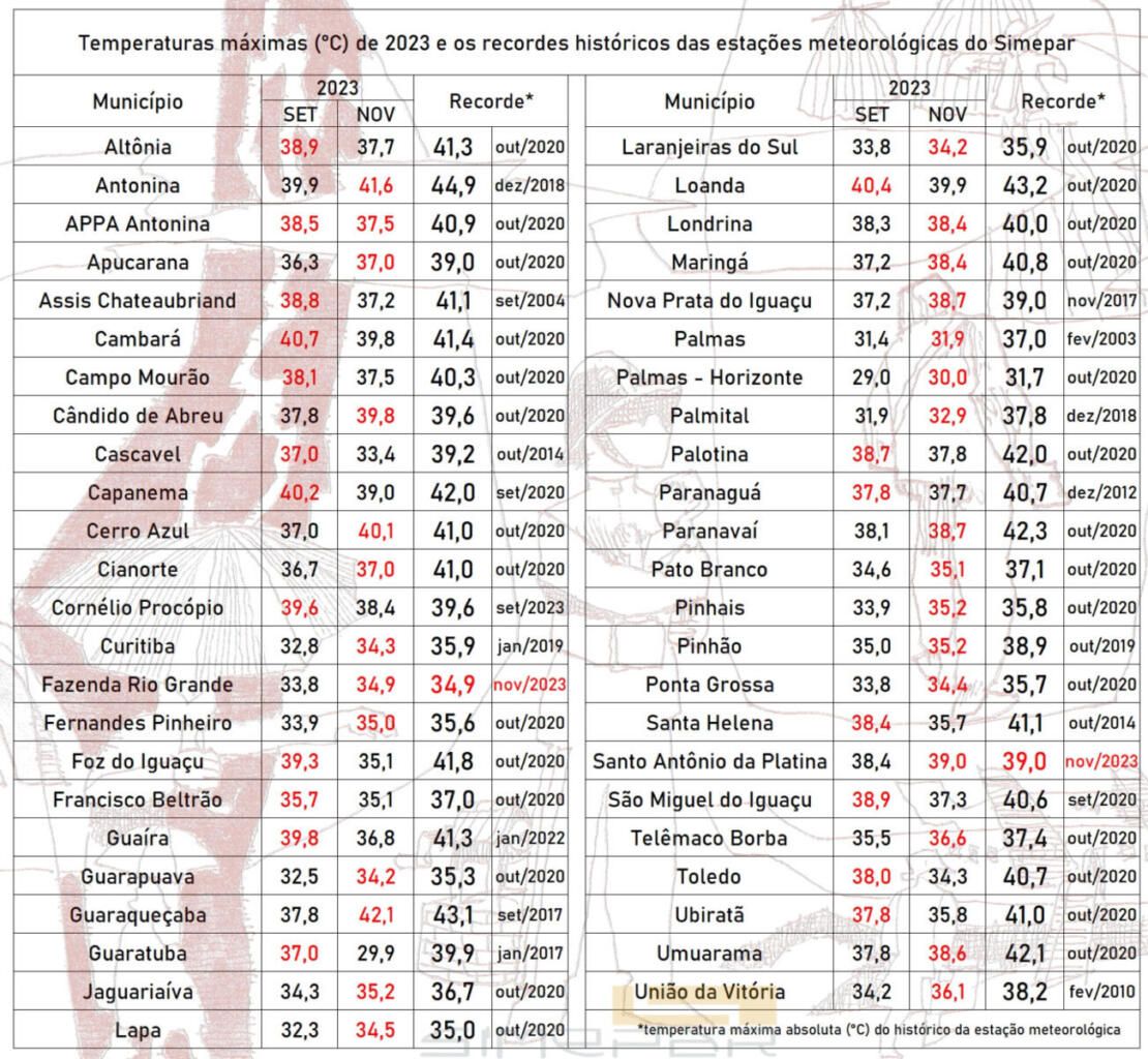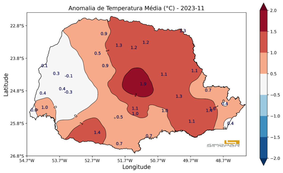 Em novembro, tivemos também a ocorrência de mais uma onda de calor que atingiu muitos estados do país, inclusive o Paraná. Em alguns setores tivemos registros das temperaturas mais altas do ano, com regiões que chegaram a apresentar quebra de recorde histórico.