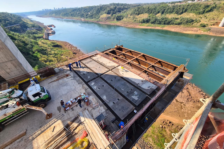 Na margem paraguaia, em Presidente Franco, foi finalizada a câmara de transição do mastro principal e iniciada a câmara de estais, que terá 34 metros de altura. Até o final do mês o mastro deve atingir 151 metros. E no vão central foram posicionadas e solidarizadas lajes pré-moldadas sobre a aduela metálica 5.1.