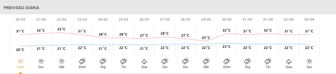 Sábado (22): Sol entre nuvens, mínima de 21°C e máxima de 33°C