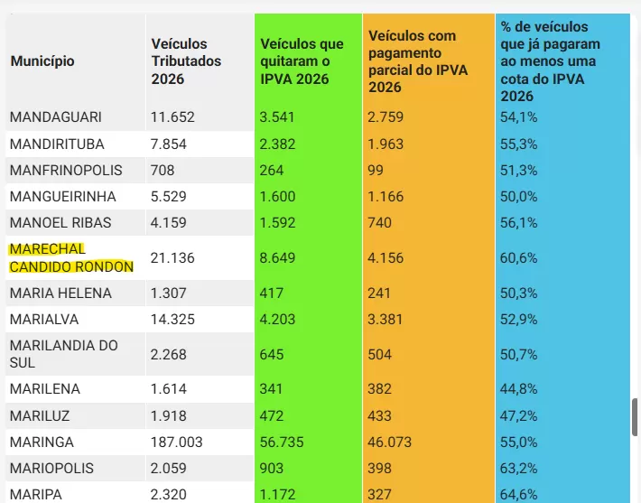 Os pagamentos do Imposto sobre a Propriedade de Veículos Automotores (IPVA) já começaram para mais de 56% dos proprietários dos veículos do Paraná, inclusive com recorde histórico nos pagamentos à vista, reflexo da adesão dos contribuintes à alíquota reduzida de 1,9% vigente em 2026. Regionalmente, cerca de um terço dos municípios paranaenses já apresenta índices de pagamento inclusive acima da média estadual. Segundo dados da Secretaria de Estado da Fazenda (Sefa) e da Receita Estadual, são 114 municípios nessa condição.