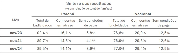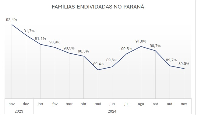 A Pesquisa de Endividamento e Inadimplência do Consumidor (PEIC), elaborada pela Confederação Nacional do Comércio de Bens, Serviços e Turismo e pela Federação do Comércio de Bens, Serviços e Turismo do Paraná (Fecomércio PR), mostra que 89,5% dos paranaenses possuíam algum tipo de dívida em novembro.