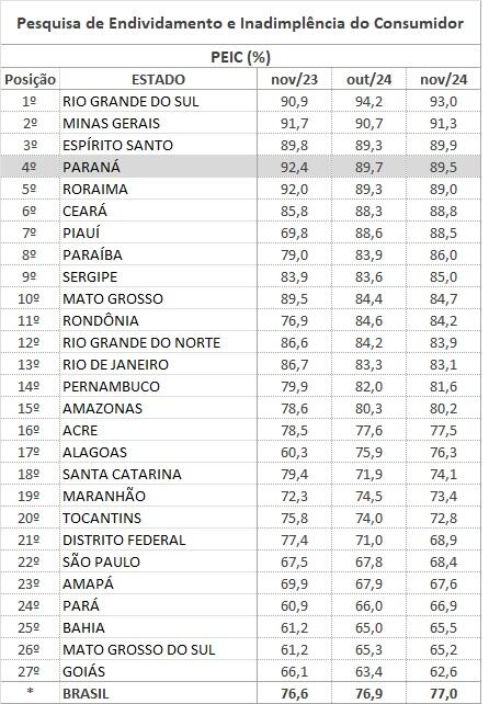 Até o mês passado, o Paraná ocupava a 3ª posição no ranking e agora fica atrás dos estados do Rio Grande do Sul, Minas Gerais e Espírito Santo. A média nacional de endividamento ficou em 77% em novembro, uma elevação ante os 76,9% em outubro.