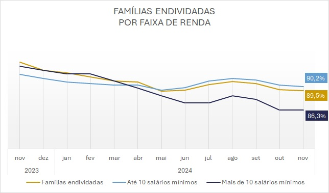 O endividamento das famílias com renda de até dez salários mínimos apresentou uma leve redução, de 90,4% para 90,2%, enquanto entre aquelas com renda superior a esse patamar, permaneceu em 86,3%.