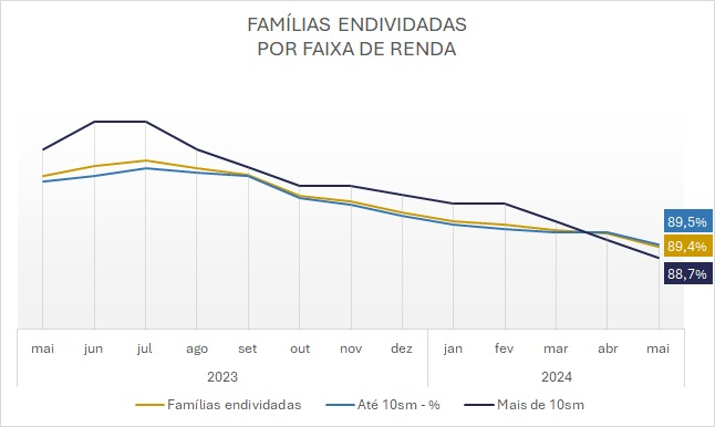 A análise detalhada por faixa de rendimentos mostra que o endividamento entre as famílias com renda de até dez salários mínimos saiu de 90,4% para 89,5%. Destas, 13,9% têm contas em atraso e 5% afirmam não ter condições de quitá-las. Para as famílias com renda acima de dez salários mínimos, o endividamento total foi de 88,7% em maio ante 89,9% em abril, com 9,5% em atraso e apenas 0,6% sem condições de pagamento.