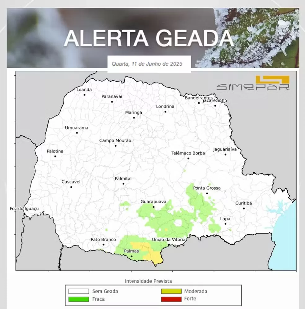 Segundo o órgão, o fenômeno deve ser registrado de forma mais intensa na quarta-feira (11), em cidades do centro-sul e em parte dos Campos Gerais, e não se descarta a ocorrência de geadas fracas na quinta-feira (13), no centro-sul do Paraná.