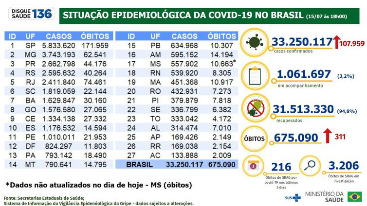 O Brasil chegou a 675.090 mortes em decorrência da covid-19, informou o Ministério da Saúde. Segundo dados da sexta-feira (15), foram confirmados 311 óbitos e 107.959 diagnósticos positivos da doença, totalizando 33.250.117 pessoas infectadas pelo coronavírus desde o início da pandemia.