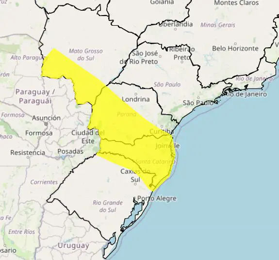 Assim como o Paraná, regiões do Mato Grosso do Sul, Santa Catarina e Rio Grande do Sul também têm alerta para vendaval.