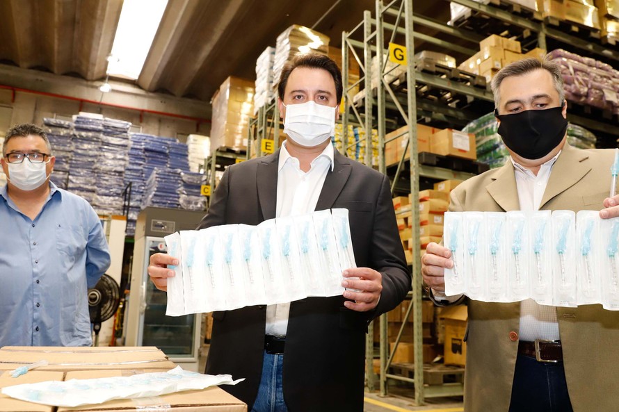 O governador Carlos Massa Ratinho Junior vistoriou nesta quarta-feira (13) o estoque dos chamados insumos secos que o Paraná já tem disponível para iniciar o processo de vacinação contra a Covid-19. São agulhas, seringas, máscaras, luvas, aventais e algodão, entre outros itens, que estão centralizados em dois pontos principais em Curitiba: o Centro de Medicamentos do Paraná (Cemepar) e o Ginásio de Esportes do Tarumã.