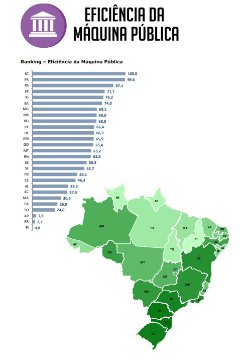 Segundo o ranking, a melhoria da eficiência da máquina do aparato governamental é condição central para o reforço da legitimidade das organizações democráticas, atributo fundamental para a construção de uma ordem virtuosa para o desenvolvimento. Esse pilar tem peso de 8,2% no ranking final, que apresentou o Paraná como terceiro estado mas competitivo do Brasil, melhor posição na série histórica.