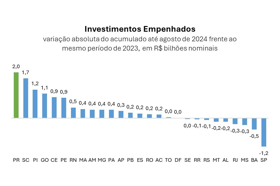 Em valores absolutos, os R$ 4,4 bilhões colocam o Paraná como terceiro estado que mais investiu em 2024, atrás apenas de São Paulo (R$ 9,9 bilhões) e Bahia (R$ 5,1 bilhões). Essa mesma posição já havia sido alcançada no levantamento da STN referente ao primeiro semestre.