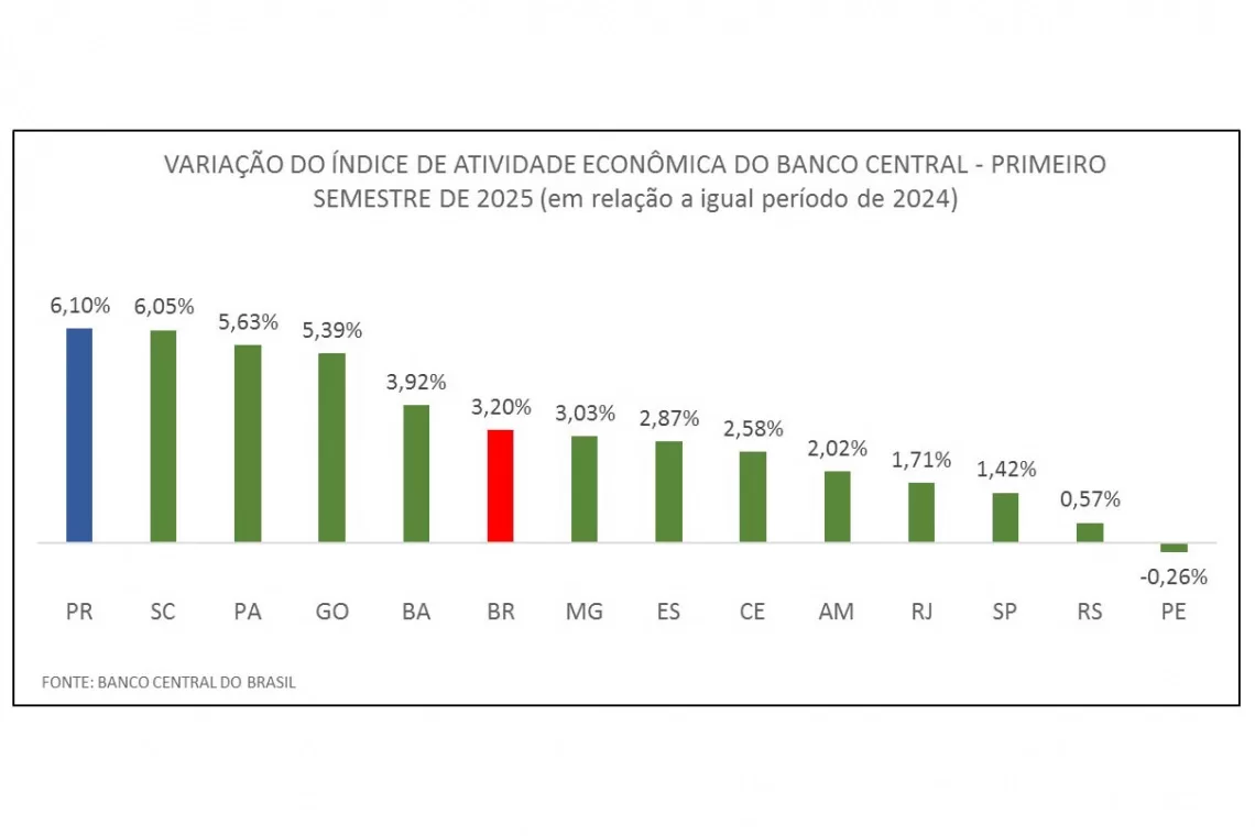 Com um avanço de 6,1% nas atividades econômicas no primeiro semestre de 2025, o Paraná lidera o crescimento econômico anual dos estados. O desempenho estadual também é praticamente o dobro do Brasil no mesmo período, cuja variação foi de apenas 3,2%, segundo dados divulgados pelo Banco Central e analisados pelo Instituto Paranaense de Desenvolvimento Econômico e Social (Ipardes).