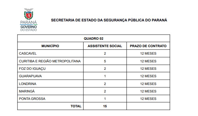 O edital prevê a contratação de 70 psicólogos e 15 assistentes sociais que prestarão serviços em todo o Paraná. A carga horária será de 40 horas semanais e a remuneração mensal de R$ 3.842,33.O processo seletivo tem validade de um ano e pode ser prorrogado uma vez por igual período.