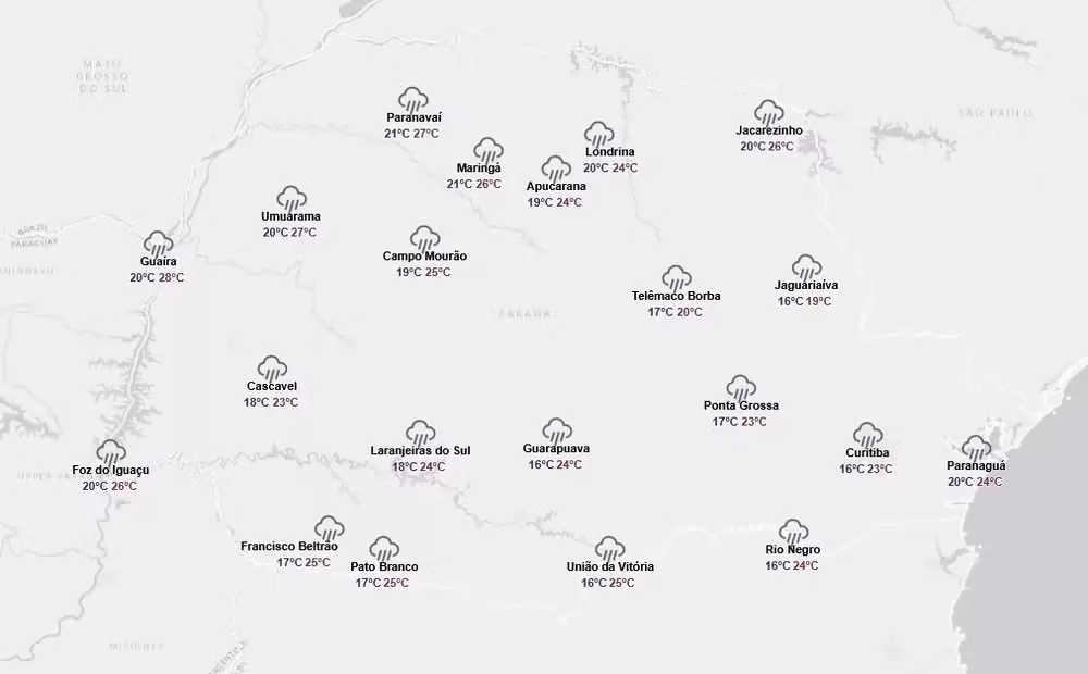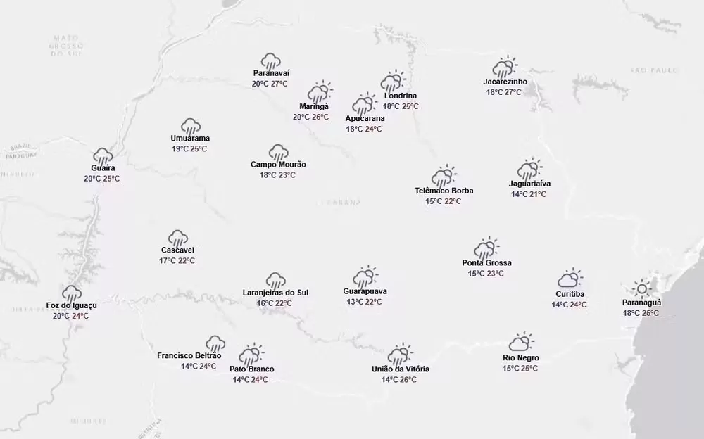 Veja, abaixo, a previsão do tempo para este primeiro fim de semana de novembro divulgada pelo Simepar neste sábado (1º):