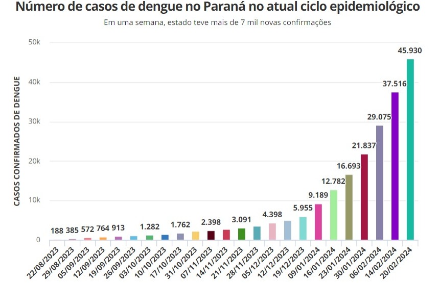 As regionais com mais casos confirmados de dengue até ao momento são as de Apucarana (11.518), Cascavel (4.130), Londrina (4.049), Paranavaí (3.964), Ivaiporã (3.678) e Maringá (3.544).