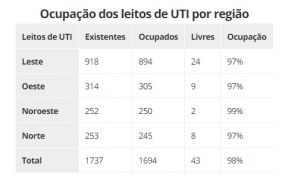 Ao avaliar a divisão de leitos por macrorregiões do estado, a região noroeste tem a maior taxa de ocupação de UTIs para adultos exclusivas para a doença, com 99% dos leitos ocupados. São 252 leitos ocupados e dois leitos vagos, segundo o boletim. A macrorregião compreende as regiões de Paranavaí, Umuarama e Cianorte.
