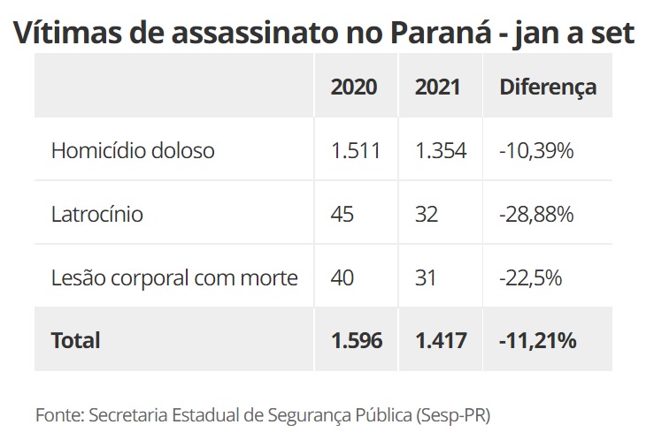 Nos primeiros nove meses de 2021, o Paraná registrou redução de 11,21% no total de assassinatos, na comparação com o mesmo período do ano passado.