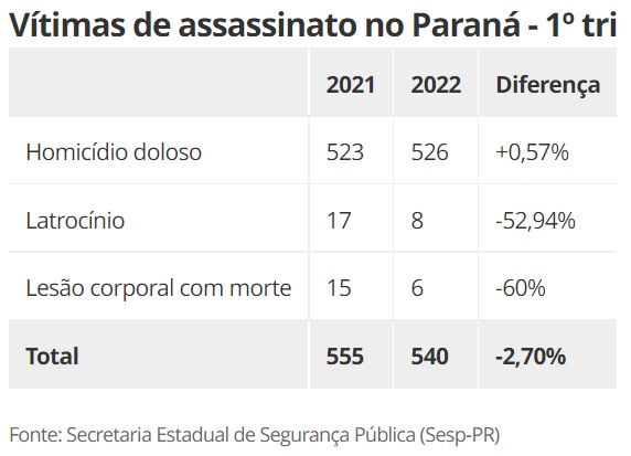 Entre janeiro e março deste ano, 540 pessoas foram assassinadas no Paraná, segundo dados informados pela Secretaria de Segurança Pública do estado (Sesp-PR), via Lei de Acesso à Informação (LAI).