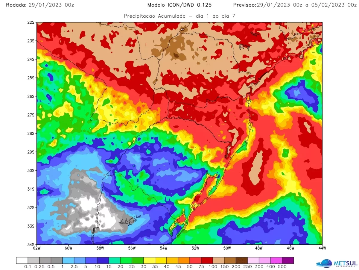 Já o segundo mapa, abaixo, traz a projeção de chuva para os próximos sete dias a partir dos dados do modelo meteorológico alemão Icon em que se observa a tendencia de acumulados de precipitação altos no Paraná na semana, de 100 mm a 200 mm na maioria das cidades, mas com índices que podem ficar acima de 200 mm em alguns.
