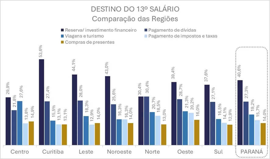 A formação de uma reserva financeira segue como principal destino do 13º salário entre os paranaenses, com maior intensidade entre os homens, que somam 44,4% das respostas, frente aos 36,7% registrados pelas mulheres.